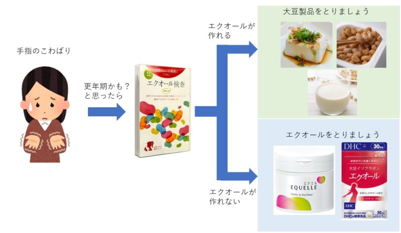実は、イソフラボンをエクオールに変換するのは腸内細菌が行っています。その働きを持つ腸内細菌を持っている日本人は50%程度と言われています。この腸内細菌を持っていなければ、エクオールそのものをサプリとして摂取する必要があります。この腸内細菌を持っているかどうかは、ソイチェック®(ヘルスケアシステムズ社)という尿検査で確認できます。