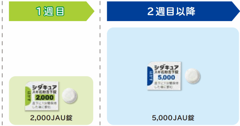 投与量は徐々に増量します(スギ花粉症なら1週間、ダニアレルギー性鼻炎なら3日から1週間)。