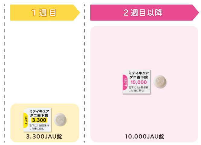 治療開始時:最初の1週間は低用量のミティキュアダニ舌下錠3,300JAUを服用します。